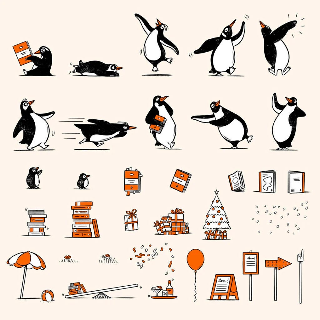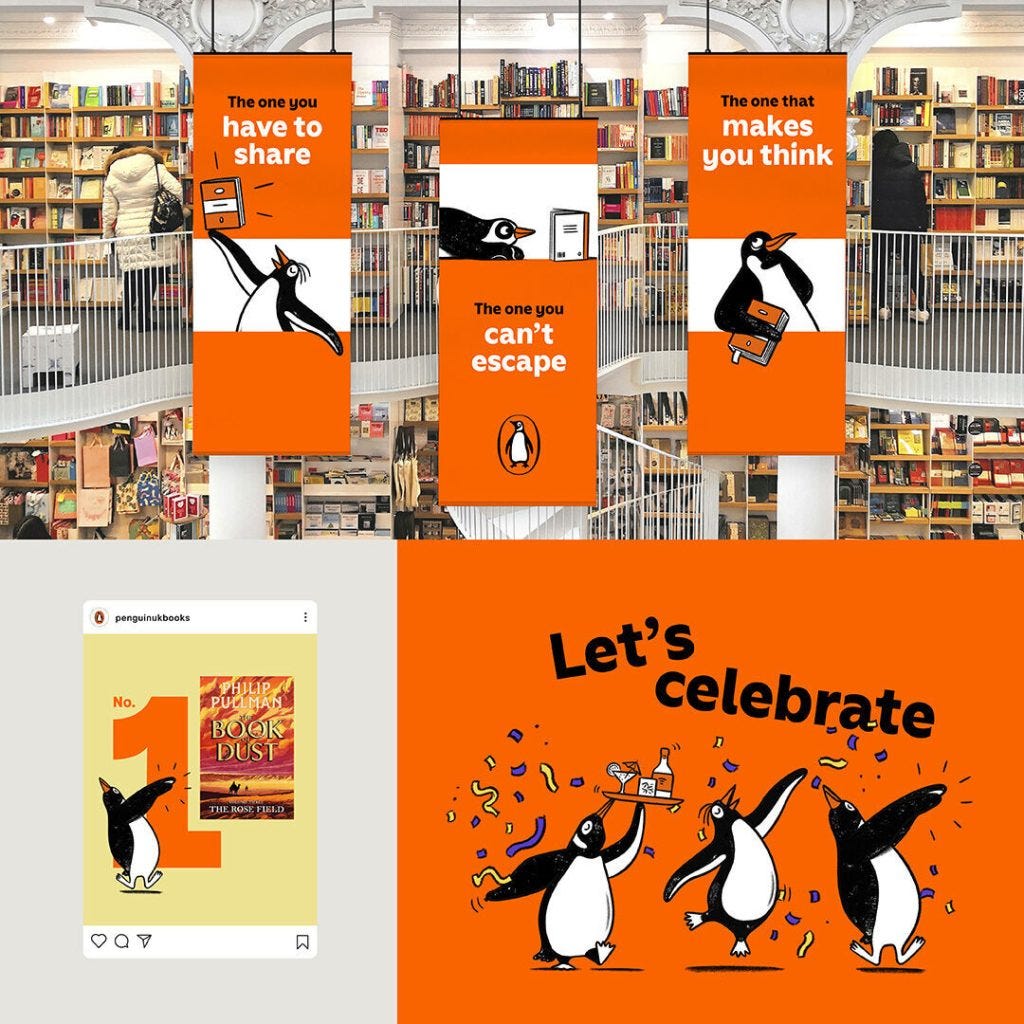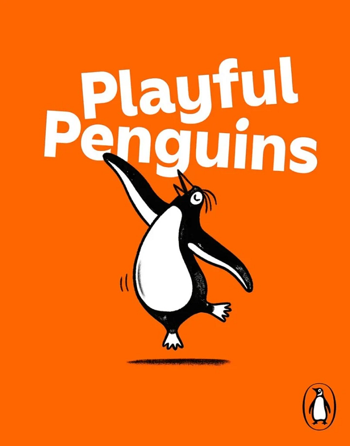 Instead, Penguin Random House expanded the logo into a full illustration system — a series of “Playful Penguins” that show the character reading, dancing, waddling, stacking books, and interacting with its environment across campaigns and platforms.